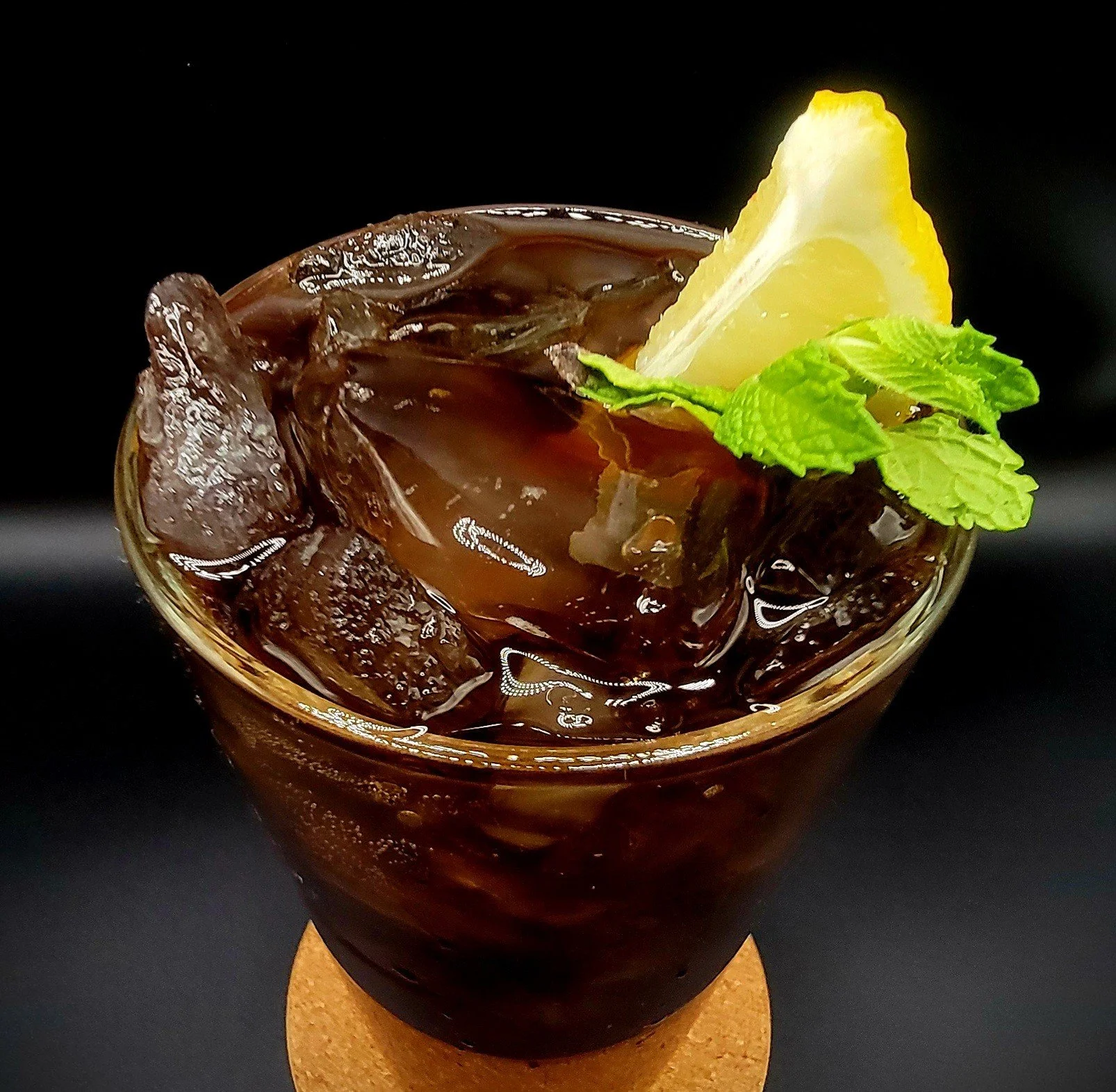 Build ingredients in cocktail shaker with ice, except for the coca cola. Gently shake a few times to chill ingredients. Pour with ice into highball or pint glass. Add splash of coke and stir gently. Add lemon wedge and mint as garnish.